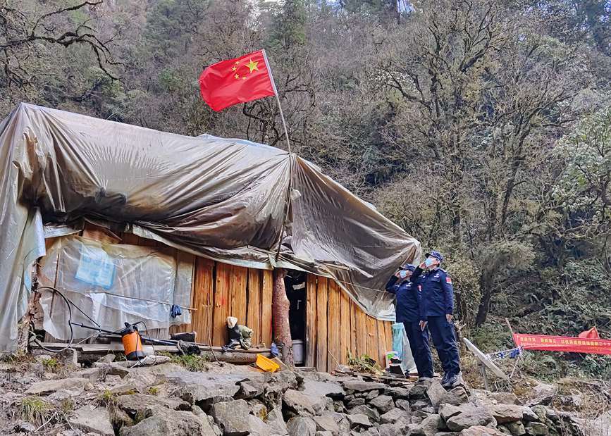 圖為春節(jié)前夕,拉郊邊境派出所移民管理警察王彥凱(左一)與同事為執(zhí)勤點(diǎn)更換新國(guó)旗后,向國(guó)旗敬禮。伊比熱恨攝