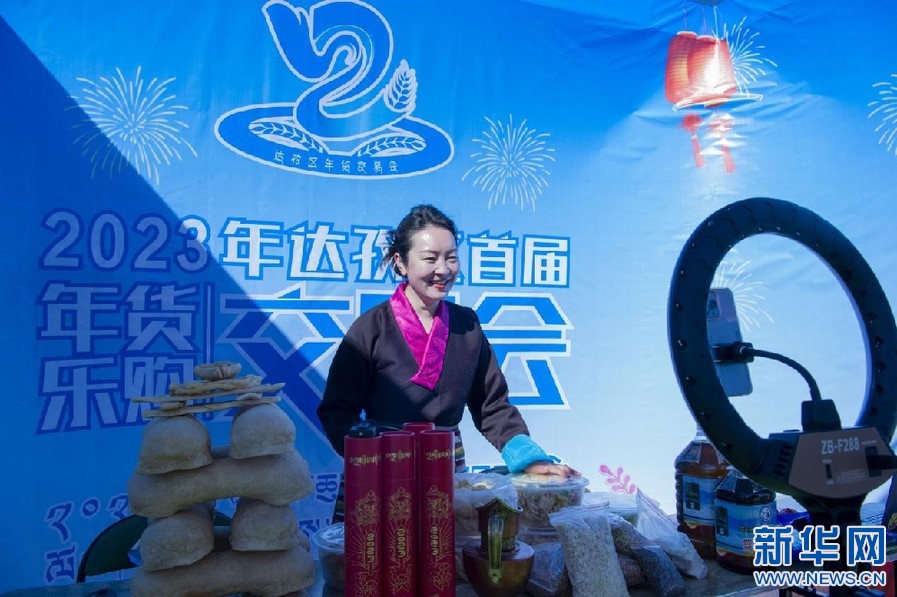 2月6日,商戶在交易會(huì)上通過直播介紹年貨。新華網(wǎng) 旦增努布 攝