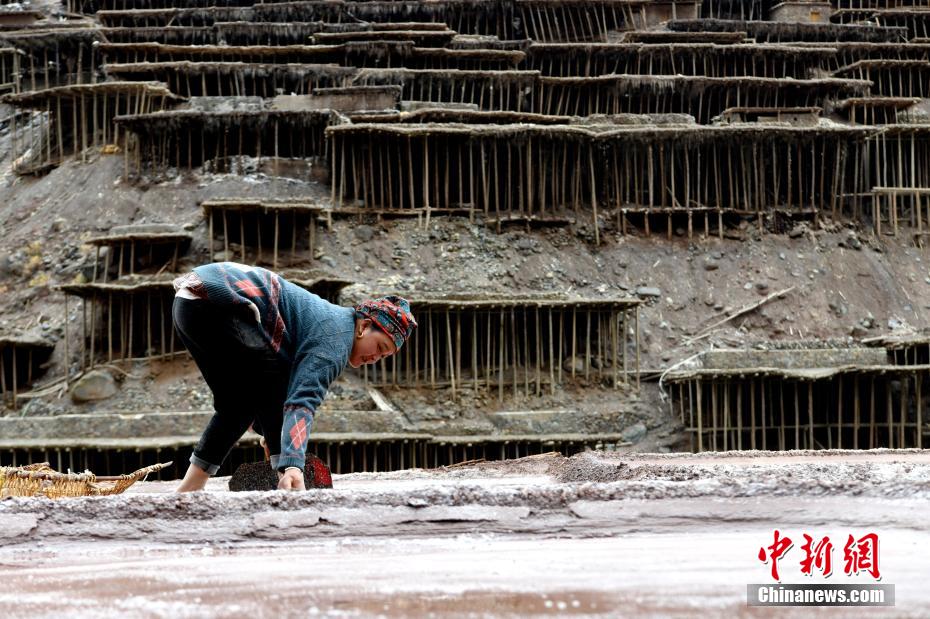 2月13日,西藏昌都芒康縣納西民族鄉(xiāng)加達(dá)村村民珍羅正在掃鹽。