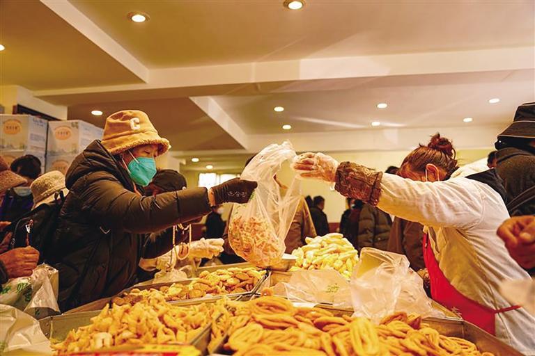 2月13日,記者走進(jìn)位于拉薩市林廓北路的龍?jiān)隹ㄈ?,香味撲鼻而?lái),不同樣式的卡塞被整齊地?cái)[放在貨架上,引得不少市民前來(lái)詢價(jià)購(gòu)買?!拔覀兪沁@家店的老顧客了,每逢過(guò)年都會(huì)來(lái)店里購(gòu)買卡塞,今年我準(zhǔn)備一次性買五六斤,讓家人吃得開(kāi)心?!笔忻裨髯楷斦f(shuō),“以前我們都是自己炸卡塞,現(xiàn)在沒(méi)時(shí)間做了,就來(lái)市場(chǎng)上買現(xiàn)成的。這家店制作的卡塞不僅樣式好看,味道也不錯(cuò),家人很喜歡,而且到店還能看到制作過(guò)程,對(duì)食品安全也比較放心?!?/p>