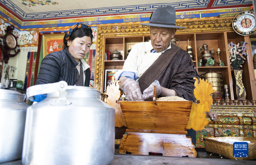 2月20日,在位于西藏拉薩市墨竹工卡縣門(mén)巴鄉(xiāng)的家中,扎西次仁用五彩青稞穗裝點(diǎn)象征吉祥的“切瑪”。新華社記者 孫非 攝