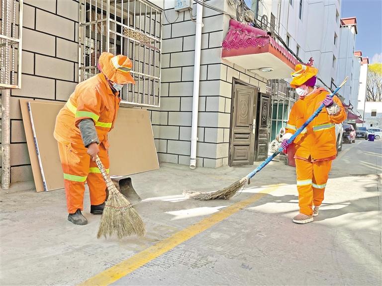 拉薩市城關區(qū)女環(huán)衛(wèi)工人在清掃地面。 旦增蘭澤 攝