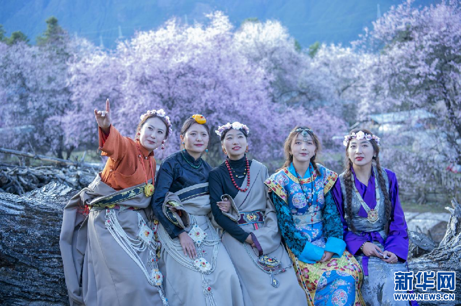 3月25日,游客在林芝市波密縣桃花谷合影留念。新華網(wǎng) 旦增努布 攝
