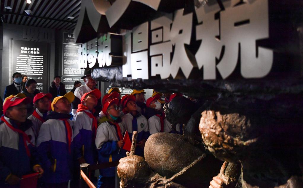 拉薩市堆龍德慶區(qū)乃瓊中心小學的學生在參觀西藏百萬農(nóng)奴解放紀念館(3月28日攝)。新華社記者晉美多吉 攝