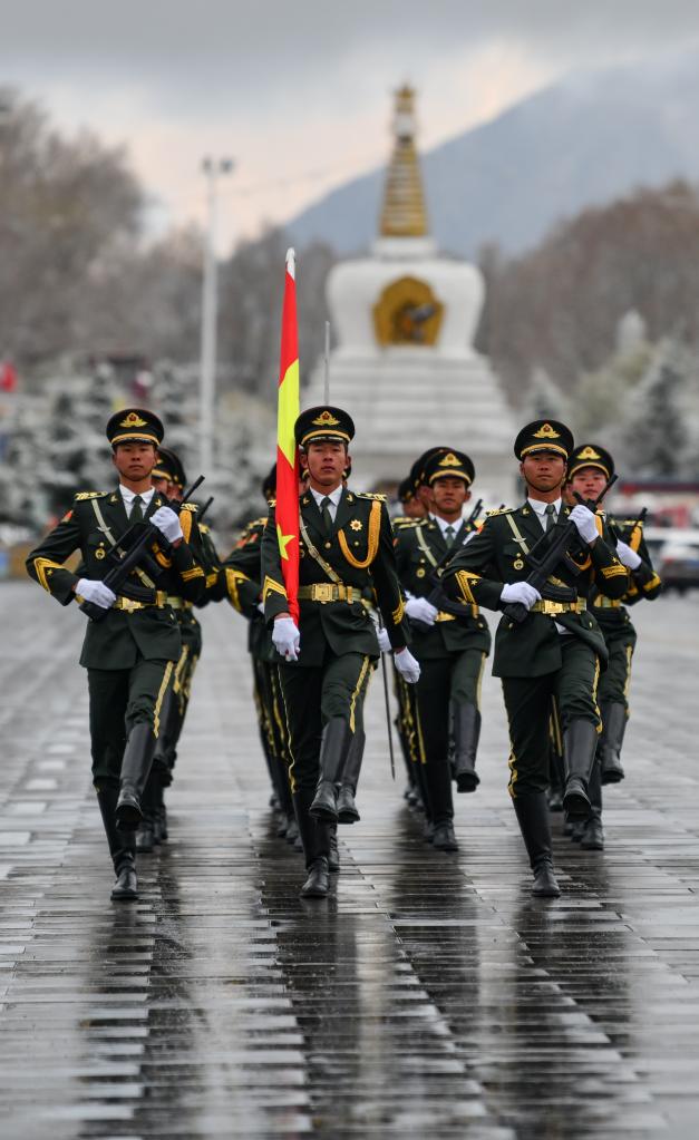 國旗護衛(wèi)隊邁著整齊劃一的步伐,把五星紅旗送到廣場升旗處(3月28日攝)。新華社記者晉美多吉 攝