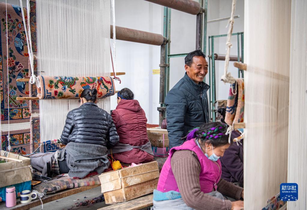 在江孜地毯廠,拉平(中)跟工人們交流(3月19日攝)。新華社記者 孫非 攝