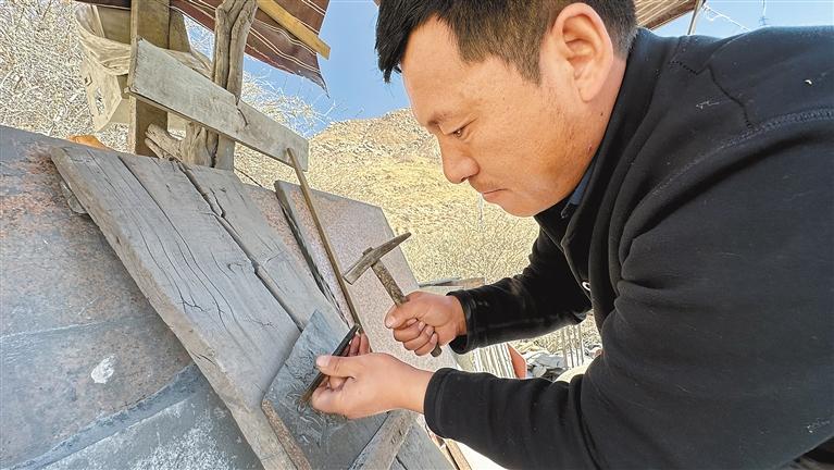 今年35歲的桑周才仁出生在石刻世家,父輩都是石匠,算起來他也是家族石刻技藝的第六代傳承人了。自幼,桑周才仁就對石頭有一種特殊的情感,14歲就開始接受父親的指導(dǎo),悉心學(xué)習(xí)刻字、線雕、浮雕、繪畫等與石刻相關(guān)的技藝?!翱套质鞘碳妓囍械幕A(chǔ),需要反復(fù)練習(xí),刻不好就得磨掉重做,直到刻出滿意的作品為止。”桑周才仁對記者說,當(dāng)時(shí)聽到父親一句“刻得很好”的評價(jià),他就能高興一整天。