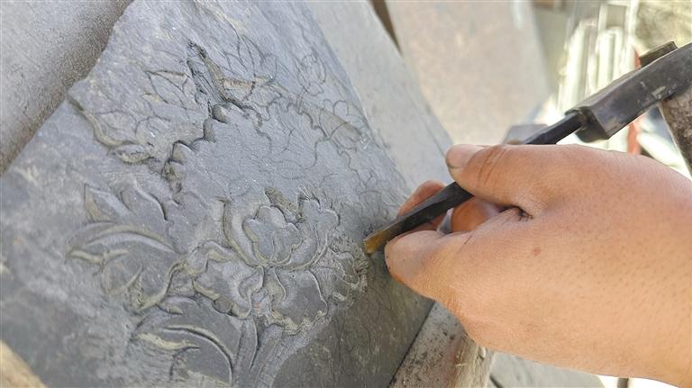 桑周才仁在認(rèn)真創(chuàng)作石刻文創(chuàng)作品。