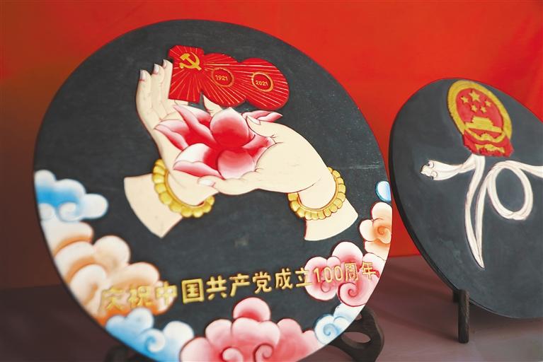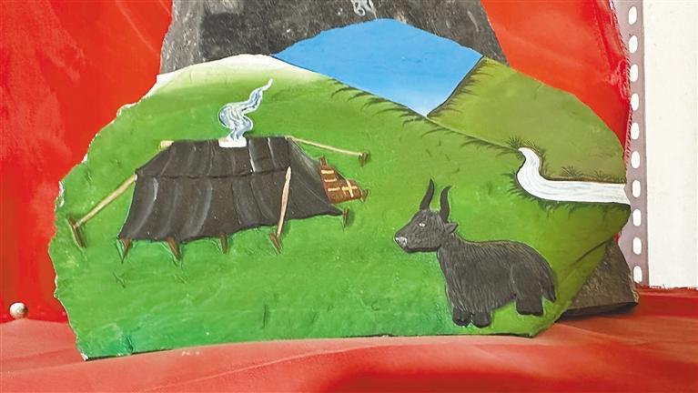 “我們首先要選好一塊石頭,根據(jù)它的形狀和質(zhì)地來決定刻成一幅什么樣的作品,然后再畫出作品的輪廓進(jìn)行雕刻,最后一步則為上色。”桑周才仁熱情地帶我們參觀他的工作室,“慶祝中國共產(chǎn)黨成立100周年”“牧家生活”“扎西德勒”“白海螺”“和氣四瑞像”……每一幅作品活靈活現(xiàn)在大大小小石板上,栩栩如生、惟妙惟肖,堅(jiān)硬的石頭在他出神入化的雕工下竟變得柔軟,又不失力量和美感。