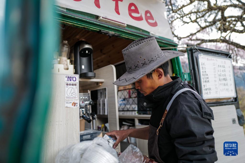 牟宜平正在桃花谷中制作咖啡(2023年3月24日攝)。新華社記者 洛卓嘉措 攝