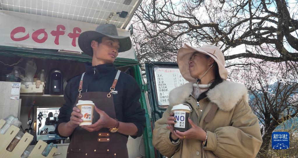 桃花谷中,咖啡車停在桃樹下,車后遠(yuǎn)處是連綿的雪山。樹上的桃花被風(fēng)吹落,一朵花瓣剛巧落在還未來得及封蓋的咖啡里,但顧客對此并不在意,“這才有林芝春天的感覺!”他說。