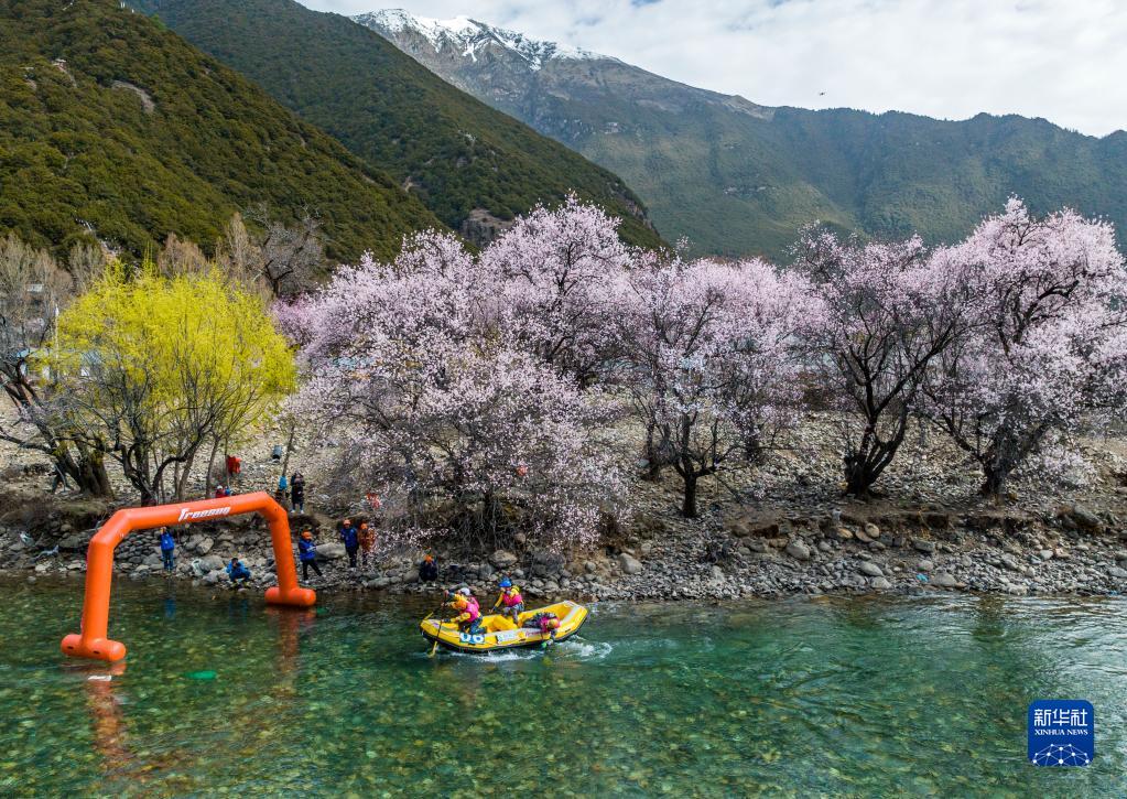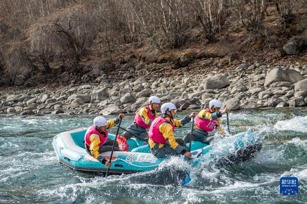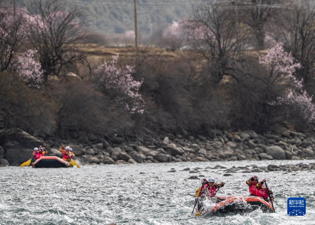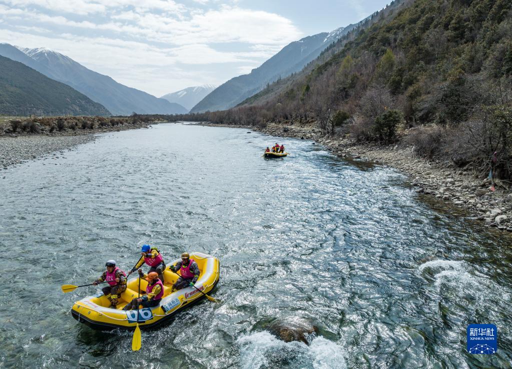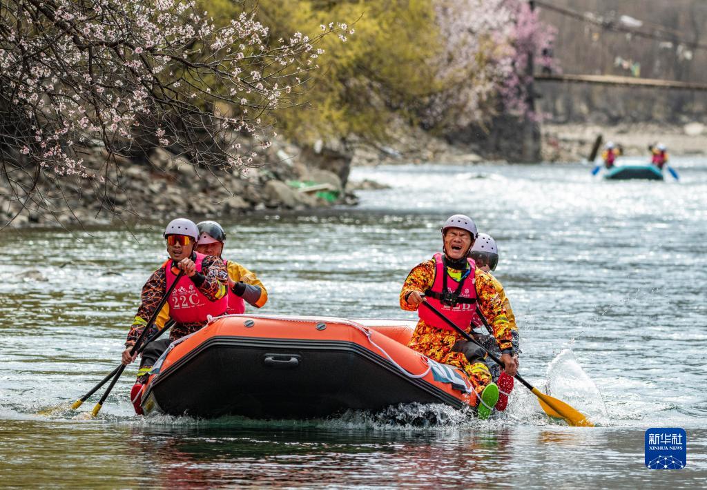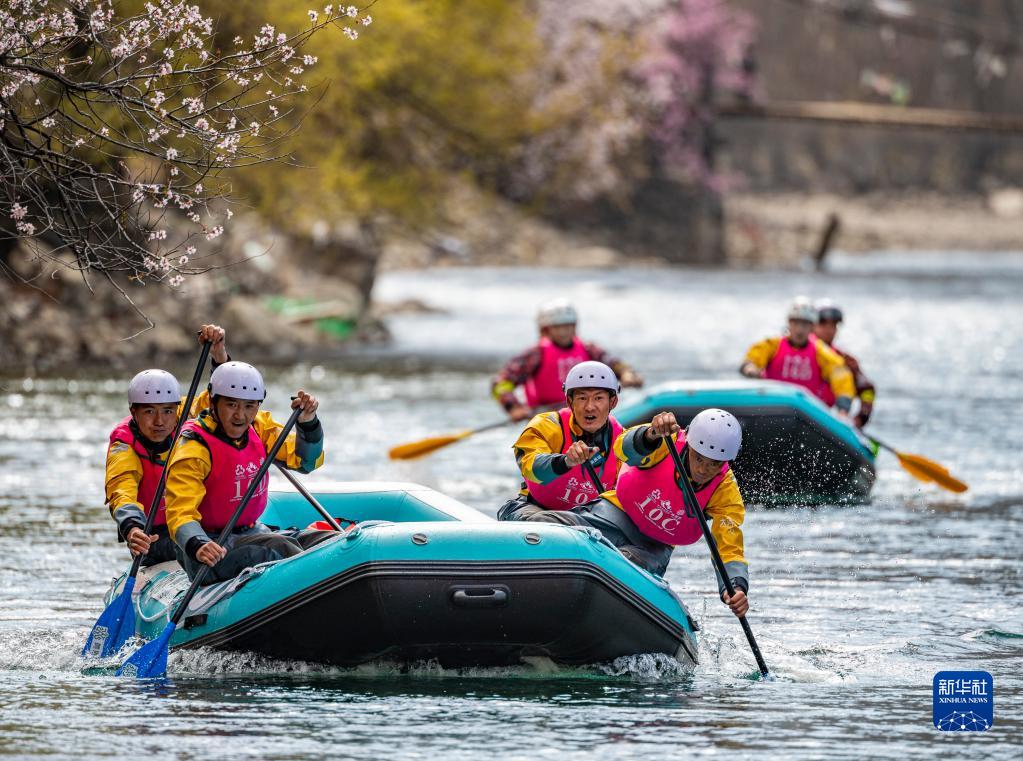 4月16日,西藏旅游股份有限公司漂流隊(duì)(前)在激流漂流筏追逐賽中。最終,他們獲得亞軍。新華社記者 孫非 攝