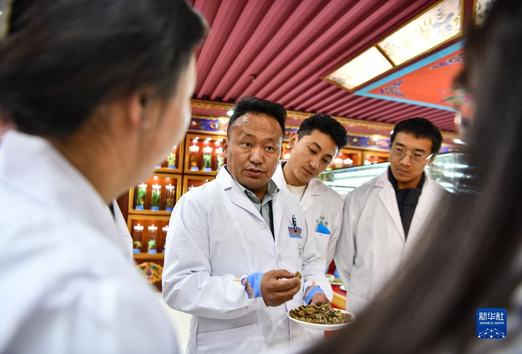 在藏藥材標(biāo)本室,普窮次仁為學(xué)生們講解藏藥材知識(shí)(4月20日攝)。新華社記者 晉美多吉 攝