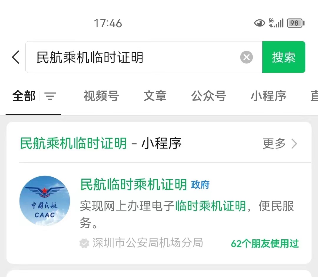 3、請(qǐng)您出示與購票時(shí)一致的有效證件辦理乘機(jī)手續(xù),以免因證件不符耽誤行程。如身份證過期或丟失,您可以在微信小程序和支付寶頁面搜索“民航臨時(shí)乘機(jī)證明”小程序進(jìn)行辦理。