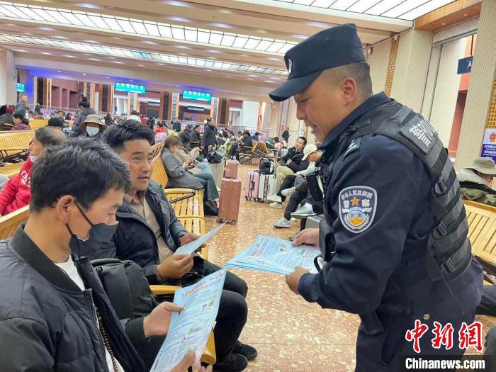 圖為拉薩鐵路公安民警為游客發(fā)放宣傳冊(cè)。 貢嘎來(lái)松 攝