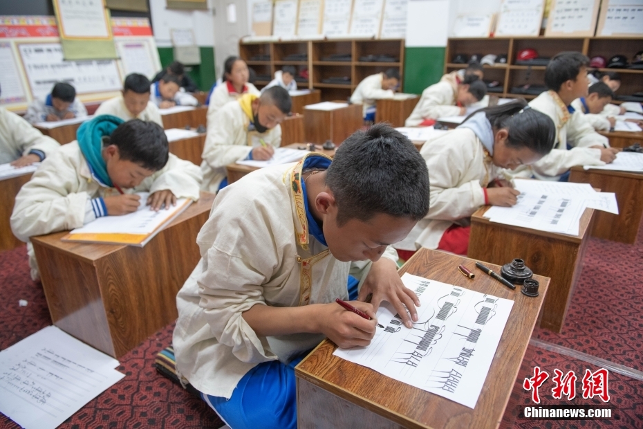 5月7日,西藏山南市,加查縣中學(xué)學(xué)生和教師在上藏文書法興趣班。該興趣班由2名藏文教師任教,每周兩課時(shí),利用自習(xí)課或晚自習(xí)時(shí)間為學(xué)生和教師授課。課程內(nèi)容包含執(zhí)筆、運(yùn)筆、姿勢(shì)等基礎(chǔ)書寫技能,以及藏文中的烏金體、珠擦體、簇仁體、簇通體等各類字體的書寫方法。