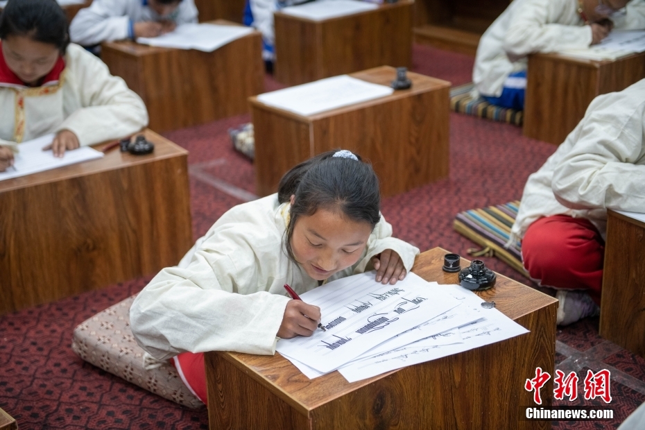 5月7日,西藏山南市,加查縣中學(xué)學(xué)生在上藏文書法興趣班。該興趣班由2名藏文教師任教,每周兩課時(shí),利用自習(xí)課或晚自習(xí)時(shí)間為學(xué)生和教師授課。課程內(nèi)容包含執(zhí)筆、運(yùn)筆、姿勢(shì)等基礎(chǔ)書寫技能,以及藏文中的烏金體、珠擦體、簇仁體、簇通體等各類字體的書寫方法。