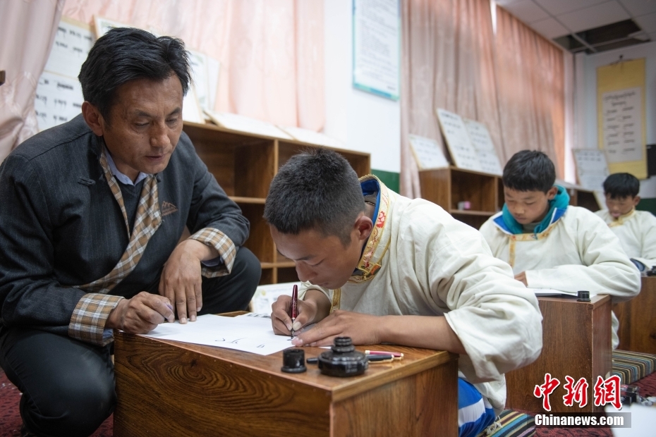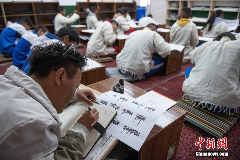 5月7日,西藏山南市,加查縣中學(xué)藏文書法興趣班的教師扎西達(dá)瓦給學(xué)生們上課。該興趣班由2名藏文教師任教,每周兩課時(shí),利用自習(xí)課或晚自習(xí)時(shí)間為學(xué)生和教師授課。課程內(nèi)容包含執(zhí)筆、運(yùn)筆、姿勢(shì)等基礎(chǔ)書寫技能,以及藏文中的烏金體、珠擦體、簇仁體、簇通體等各類字體的書寫方法。