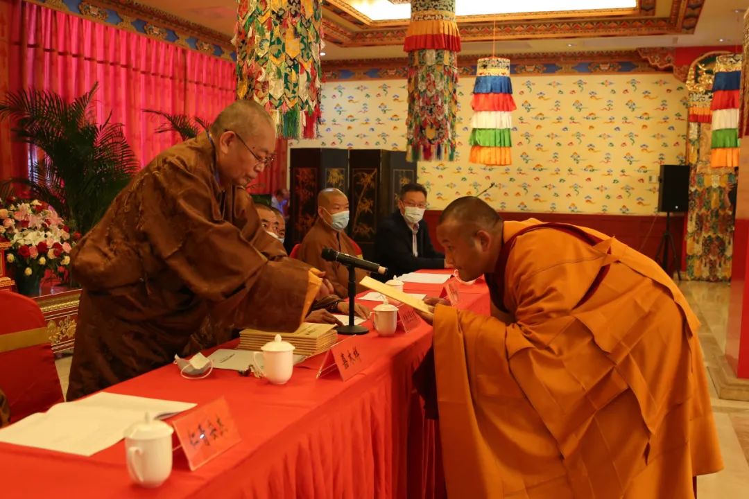 中國佛教協會副會長、藏傳佛教學銜工作指導委員會主任、中國藏語系高級佛學院院長嘉木樣活佛向“拓然巴”高級學銜獲得者頒發(fā)學銜證書。中國佛教協會副會長、藏傳佛教學銜工作指導委員會副主任珠康·土登克珠活佛向“拓然巴”高級學銜獲得者表示祝賀。