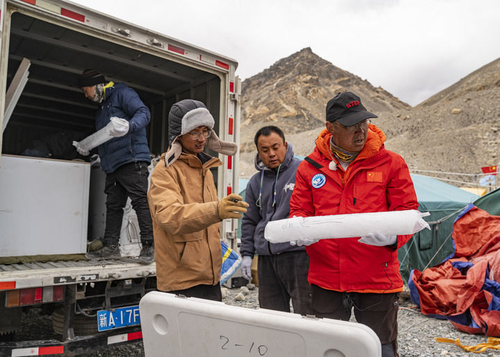 在珠峰登山大本營(yíng),中科院西北生態(tài)環(huán)境資源研究院副院長(zhǎng)康世昌查看從珠峰海拔約6500米處鉆取的冰芯樣品(5月22日攝)。新華社記者 孫非 攝