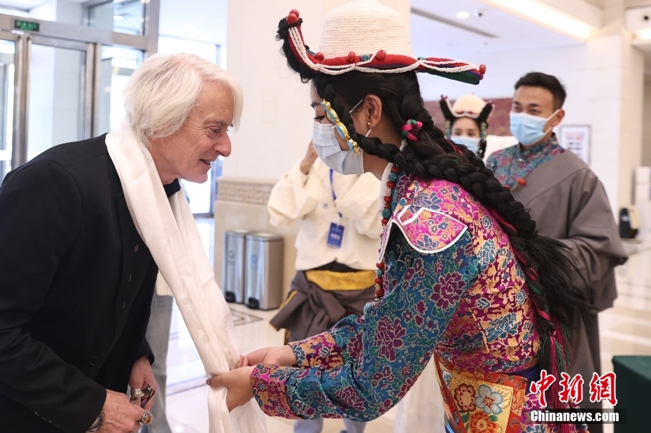 5月23日,“2023·中國西藏發(fā)展論壇”在北京舉行。會場外,活潑獨特的藏式迎賓舞蹈、展示西藏人文自然風貌的圖片,已在論壇開幕前預熱起探討西藏新發(fā)展的氛圍。圖為著名紀錄片導演、全球化智庫(CCG)高級研究員龍安志(Lawrence Brahm)接受哈達。