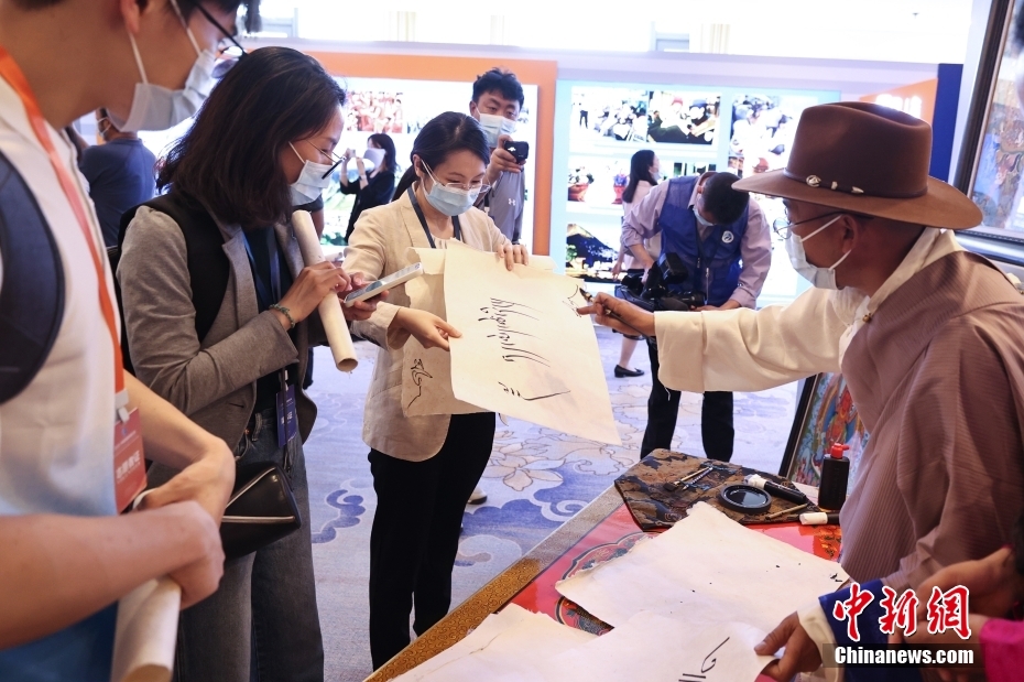 5月23日,“2023·中國西藏發(fā)展論壇”在北京舉行。會場外,活潑獨特的藏式迎賓舞蹈、展示西藏人文自然風貌的圖片,已在論壇開幕前預熱起探討西藏新發(fā)展的氛圍。圖為藏族藝人現(xiàn)場進行藏文書法創(chuàng)作并將作品贈送給來賓。