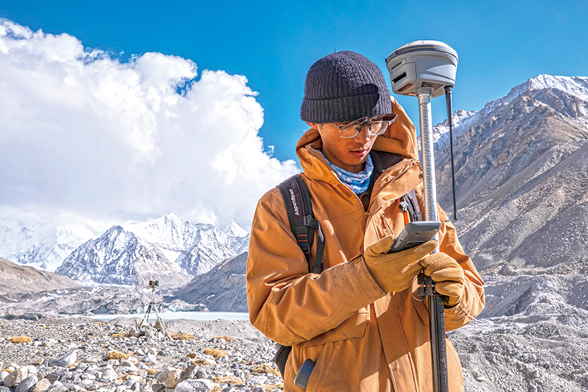 來自中國科學(xué)院西北生態(tài)環(huán)境資源研究院的科考隊(duì)員薛雨昂在對冰川進(jìn)行實(shí)時(shí)差分GPS定位(5月15日攝)。新華社記者晉美多吉攝