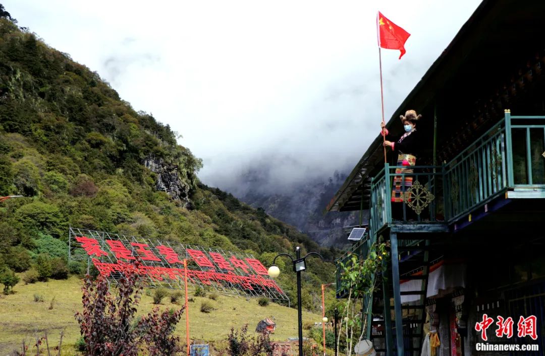 西藏邊陲村落玉麥掛國(guó)旗迎國(guó)慶。扎西白瑪 攝