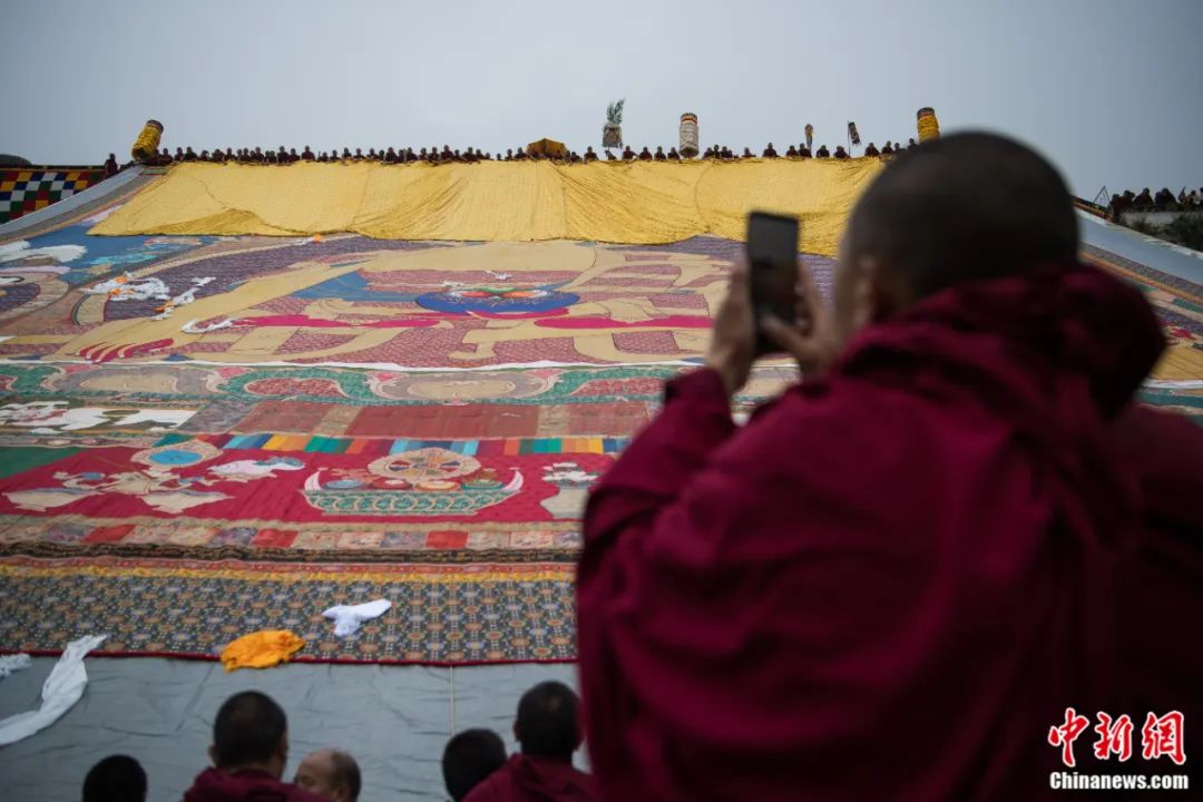 西藏拉薩哲蚌寺舉行展佛活動(dòng),僧人用手機(jī)記錄。何蓬磊 攝