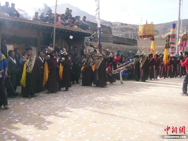 2、舞蹈在村莊廟宇外的一個(gè)大廣場(chǎng)上進(jìn)行,舞者主要是僧侶。