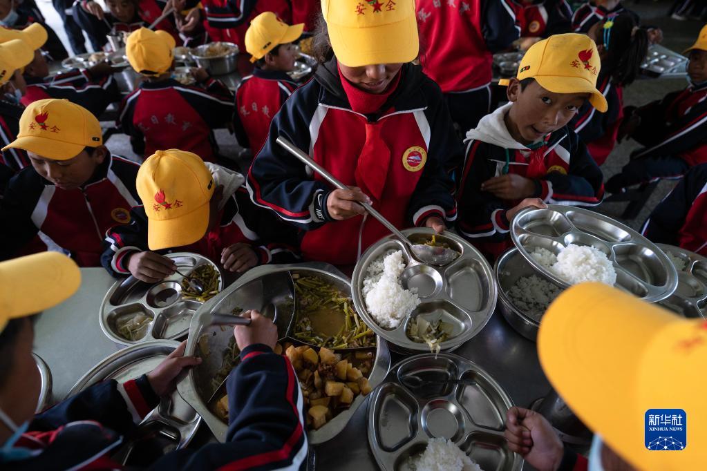 6月5日,扎西宗鄉(xiāng)完全小學的學生在食堂吃午飯,值日生負責給大家打飯菜。新華社記者 費茂華 攝