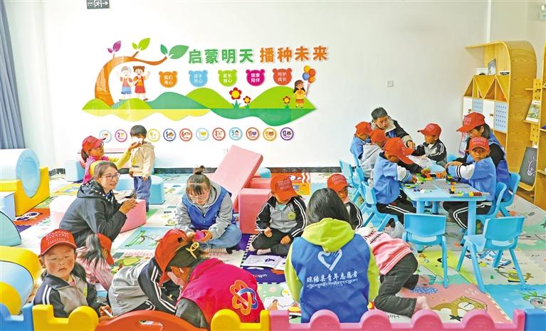 圖為志愿者陪伴瓊結(jié)縣加麻鄉(xiāng)昌嘎村兒童在該村日間照料中心婦幼兒童功能區(qū)玩耍。劉楓 本報通訊員 熊起樊 攝