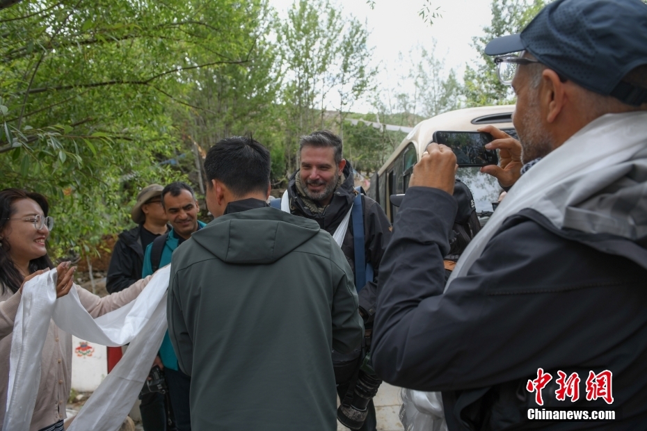 6月15日,西藏拉薩,尼木縣吞巴鎮(zhèn)吞達村村民給來訪記者們敬獻哈達,表示歡迎。在第五屆中國西藏旅游文化國際博覽會召開之際,國務院新聞辦組織中外媒體記者赴西藏采訪,路透社、共同社、西班牙埃菲社、意大利安莎社、新加坡《聯(lián)合早報》和中央廣電總臺、中國日報等15家媒體的20名記者參加。6月15日,采訪團一行前往拉薩市尼木縣參訪體驗西藏傳統(tǒng)藏香、藏紙文化。