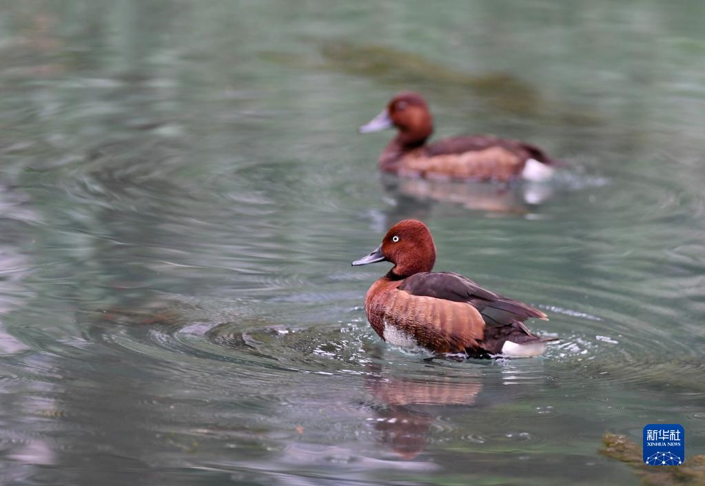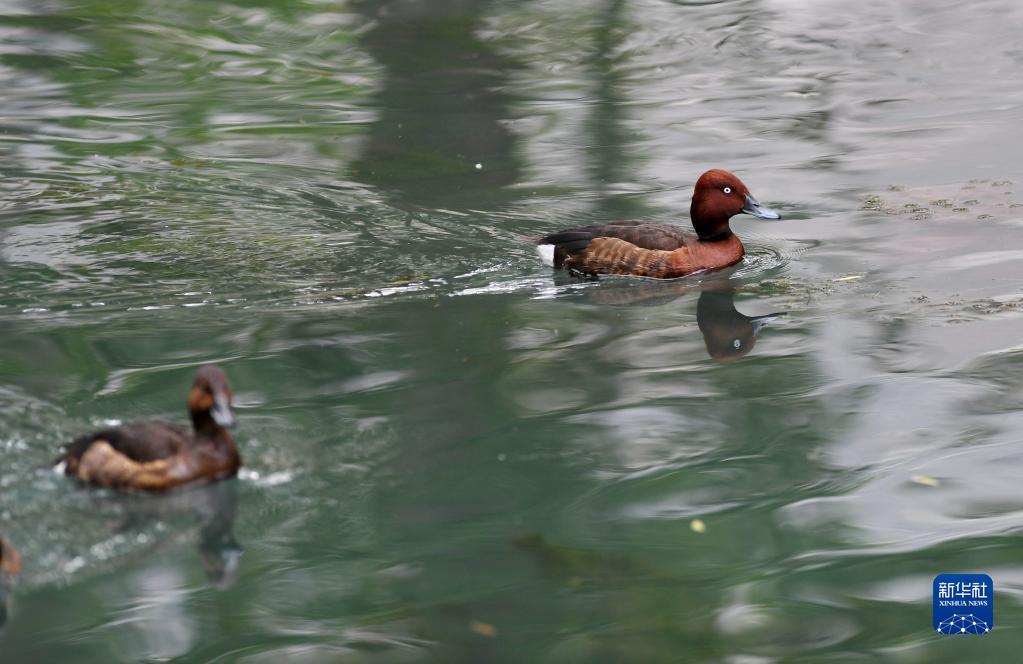夏日里,白眼潛鴨和鳳頭潛鴨在西藏拉薩市拉魯濕地國家級自然保護(hù)區(qū)中干渠里覓食、嬉戲。