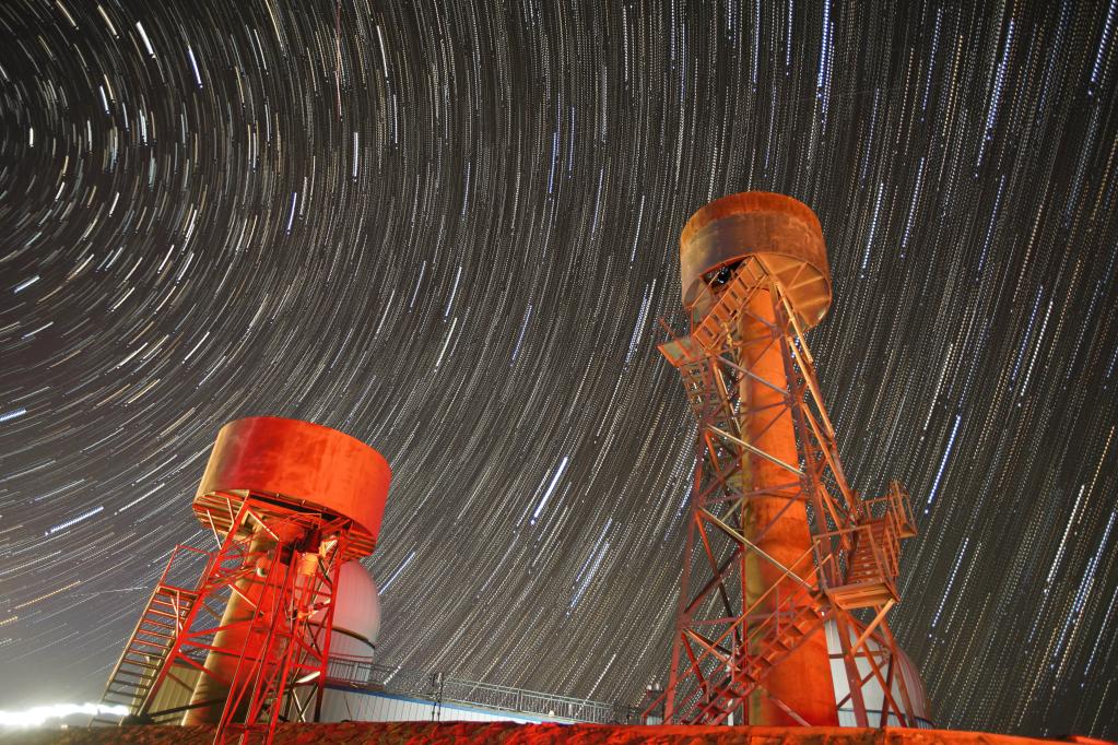 在拍攝天文臺星軌時,天空已經(jīng)完全黑了,在相機(jī)的取景器里并不能實時看見天空和星星以及其他的拍攝對象,這時候我們只能先長曝光拍一張圖,再結(jié)合自己拍好的圖,根據(jù)感覺來慢慢調(diào)整構(gòu)圖,再進(jìn)行曝光拍攝。如此經(jīng)過三四次長曝光拍攝以后,才拍到了自己想要的圖片,我的一張星軌照片就是這樣被拍攝了出來。
