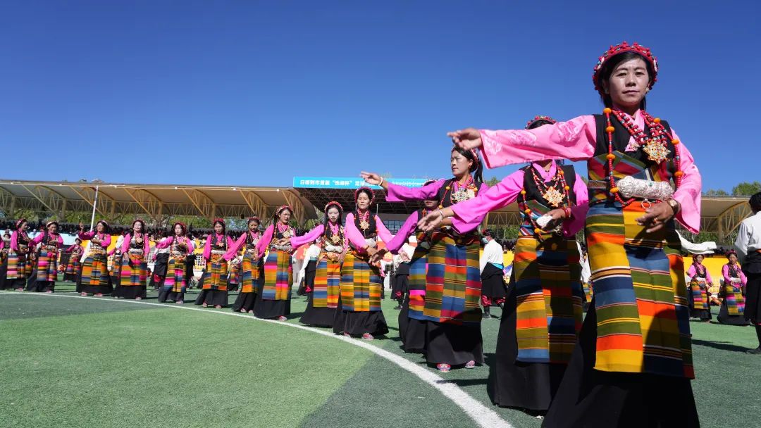 伴隨場上一陣強勁有力的鼓點響起,來自各縣的演員身著節(jié)日盛裝,堆諧、洛諧、司馬卓等民間歌舞風格獨特、歷久彌新,在幾層大半圓橫排式的流動陣型中慢慢變換成太陽、月亮、滿天星等陣型。