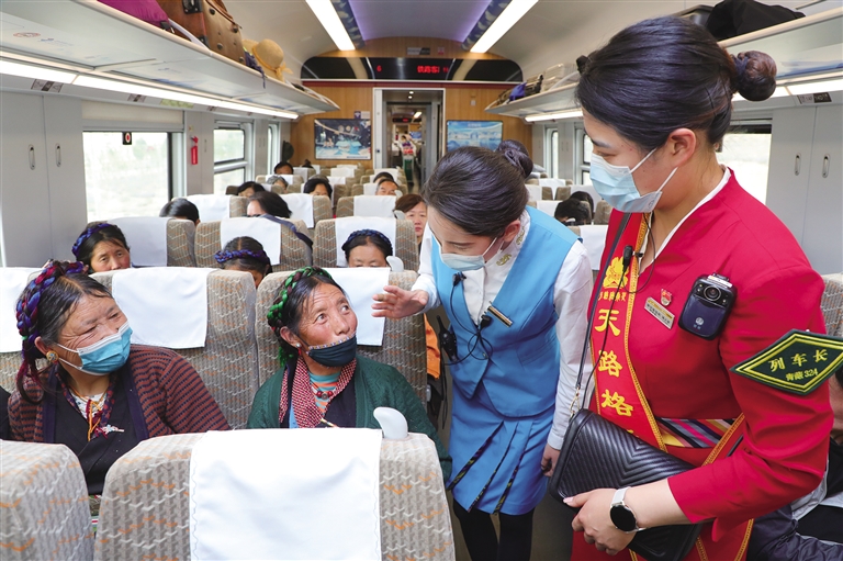 2022年初,青藏集團有限公司在管內(nèi)各站、車開展“天路格?;ā逼放苿?chuàng)建以來,拉林鐵路各車站、各次列車上都能看到“天路格?;ā狈贞爢T,他們用真誠、熱情、熱心為每一位旅客提供溫馨細致的服務?!?月初,我?guī)е⒆觼砦鞑芈糜危?月20日前往林芝,游玩了三天,由于家里有事,不得不趕回去,就買了今天中午回拉薩的火車票,剛開車不久我姑娘就發(fā)燒,肚子痛。列車員看見孩子難受就詢問情況,并找來列車長周晶,通過廣播為我們找醫(yī)生,還好沒啥大事,就是腸胃感冒,我也就放心了。周晶車長也一直在旁邊幫我照顧孩子,拿濕毛巾擦臉,蓋毛毯,送來熱水,太細心了,讓我很感動。她們工作認真負責,服務周到,我一路上都親身感受到了高原動車的熱情?!痹?4日林芝到拉薩的C926次列車上,來自四川的高雅女士拉著記者激動地說。