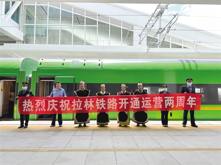 2021年6月25日,拉林鐵路開通運營,結(jié)束了藏東南不通鐵路的歷史,復興號動車開到西藏,駛上拉林鐵路,拉薩至山南、林芝最快1小時4分、3小時30分可達;山南至林芝最快2小時22分可達,相比汽車,從拉薩到林芝的時間幾乎節(jié)省了一半,從山南到林芝,也節(jié)省了2個多小時。兩年來,隨著運行方式逐漸成熟,鐵路方便、快捷的運輸優(yōu)勢逐步顯現(xiàn),客流持續(xù)攀升,青藏集團有限公司及時根據(jù)客流情況在周末、節(jié)假日、寒暑假等客流高峰期增開281趟臨時旅客列車。兩年來,拉林鐵路共運送旅客182.5萬人次,運輸貨物41.91萬噸,拉近了藏東南地區(qū)9個城市的距離,也深刻改變了當?shù)厝嗣竦墓ぷ骱蜕钣^念。