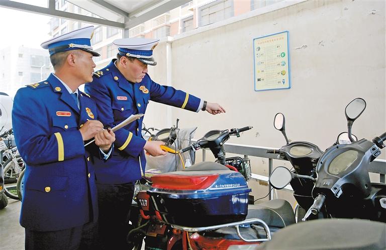 圖為消防指戰(zhàn)員深入小區(qū)檢查有無電動車違規(guī)充電現(xiàn)象。