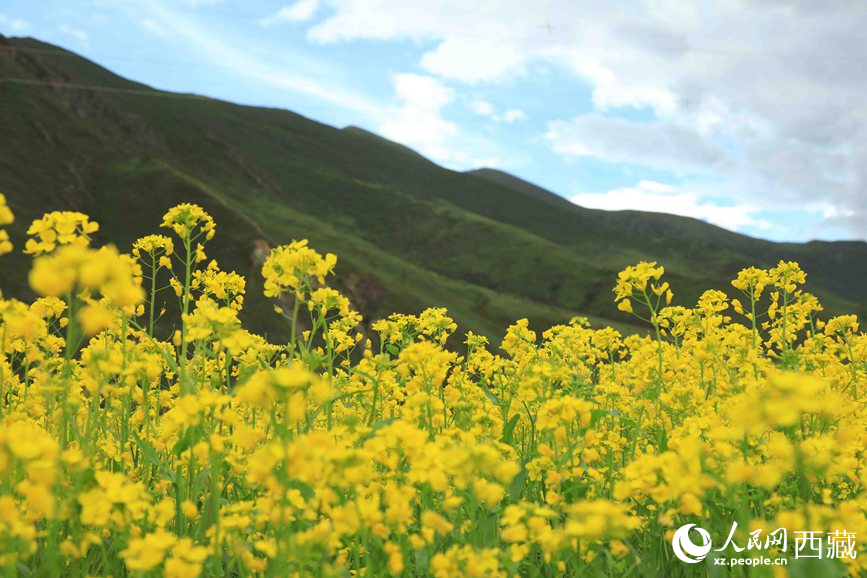 七月,正值拉薩墨竹工卡縣油菜花盛放的季節(jié)。經(jīng)過(guò)充足的光照、豐沛的雨水,大地仿佛披上金毯,黃燦燦的油菜田與翠綠的山巒構(gòu)成了一幅美麗的鄉(xiāng)野畫(huà)卷。
