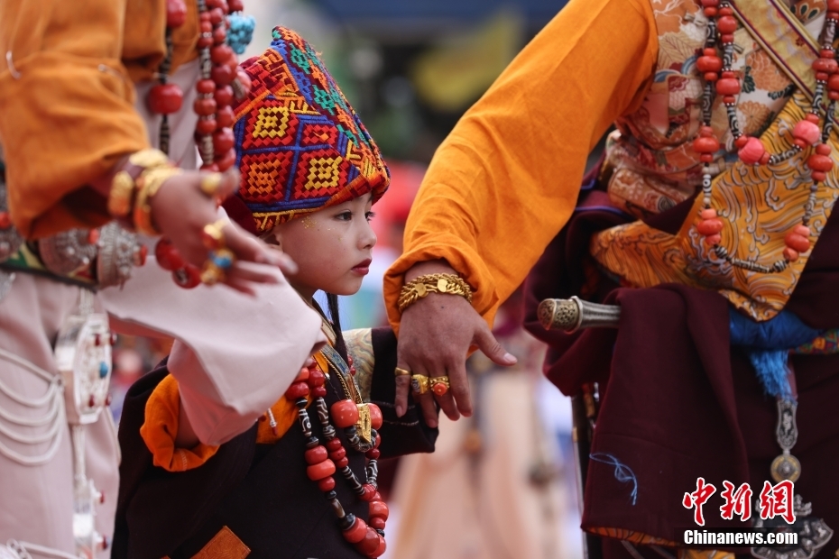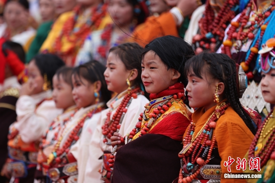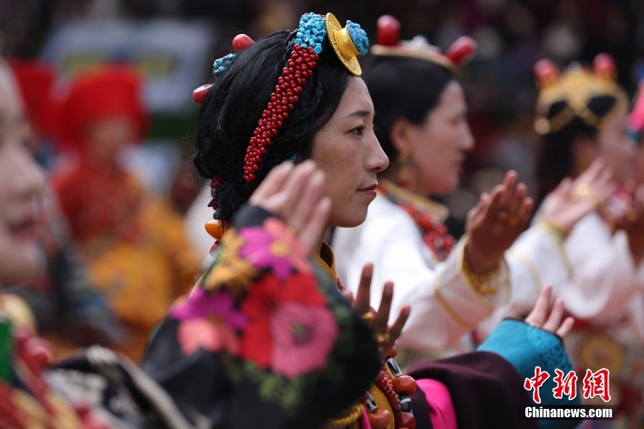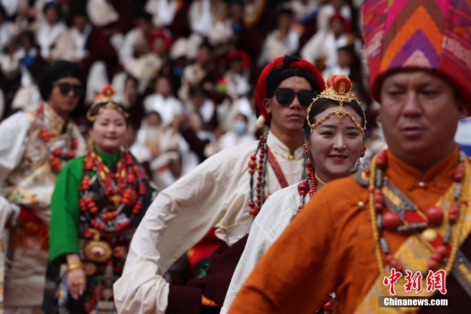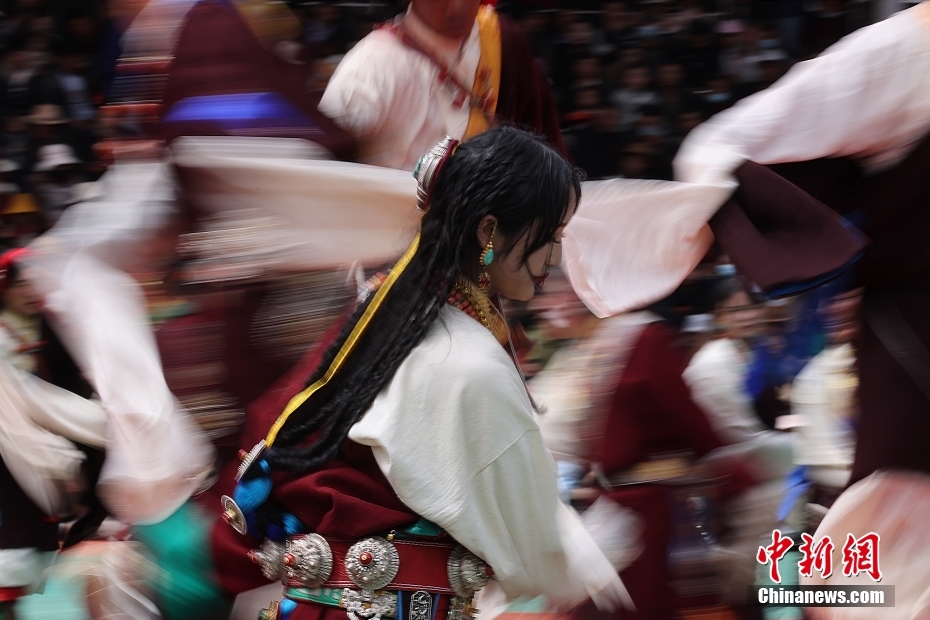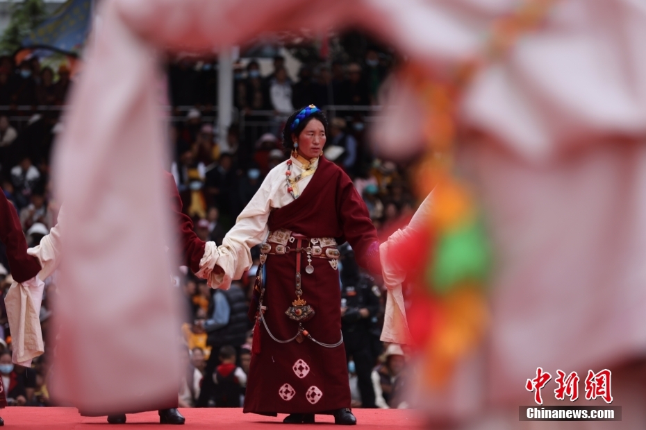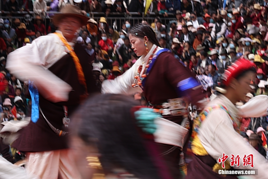 7月17日,西藏自治區(qū)昌都市貢覺縣,民眾身著極具特色的民族服裝服飾,載歌載舞出席當?shù)氐奶厣椪够顒印?/p>