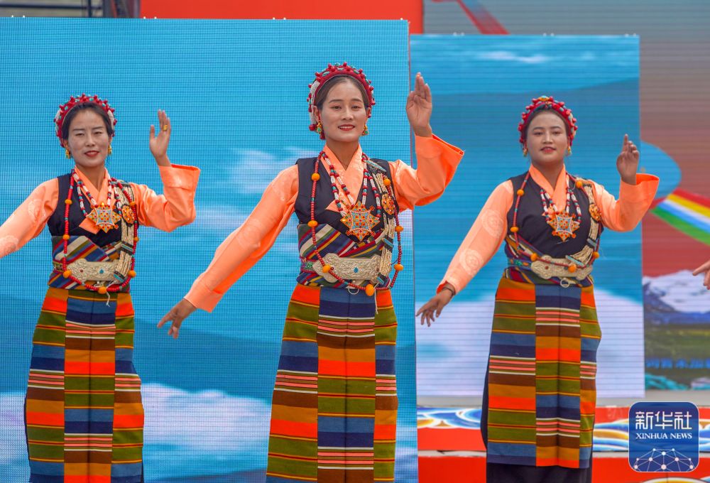 格桑卓瑪(中)和拉孜縣藝術團的隊友一起表演堆諧(8月4日攝)。