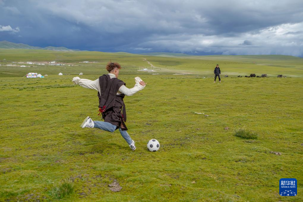 8月11日,旦增旺久和朋友在草原上踢足球。旦增旺久是次扎達(dá)兒子列熱覺(jué)旦的表哥,遠(yuǎn)在千里之外的湖南上學(xué),但還會(huì)經(jīng)常想起“隆達(dá)熱巴”。正值暑假,回到草原的他會(huì)細(xì)心地為“隆達(dá)熱巴”梳毛,跟它說(shuō)悄悄話(huà)。新華社記者 邵澤東 攝