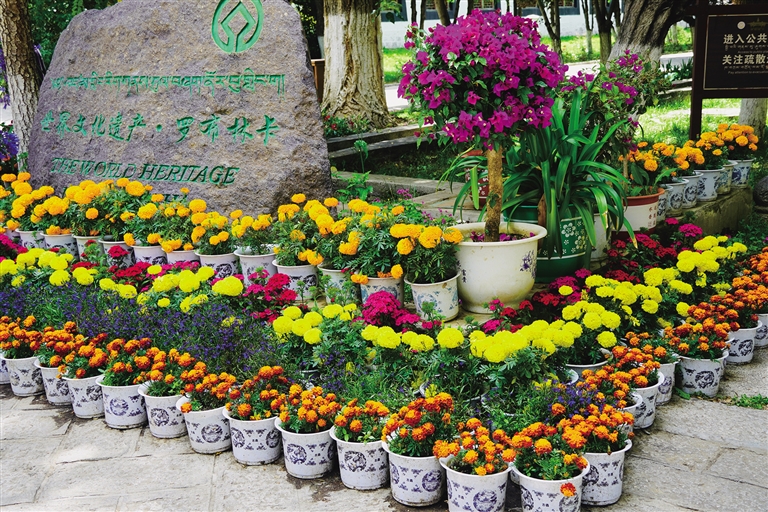 在達旦明久頗章附近一盆盆鮮花整齊地擺放在道路兩旁,各類品種的花卉在園林工作人員的精心搭配下,變得更加絢麗奪目,吸引了不少人駐足觀賞。