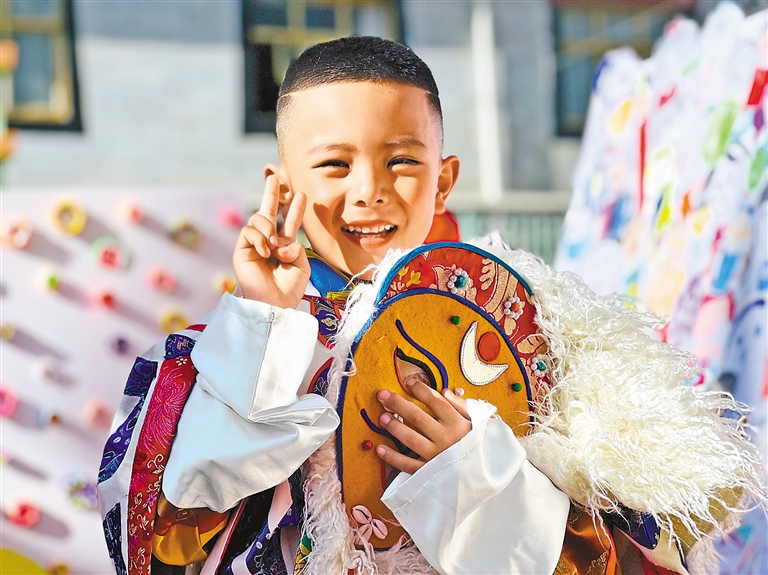 “非遺進校園”活動中,小朋友戴上藏戲面具,感受非遺文化。記者 格桑倫珠 攝