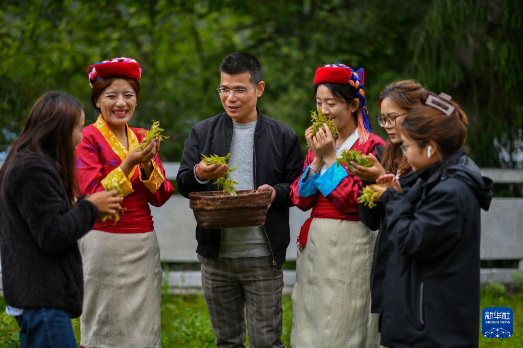 尼瑪卓瑪(右)與村民一起品嘗新制成的莓茶(7月28日攝)。新華社記者 姜帆 攝