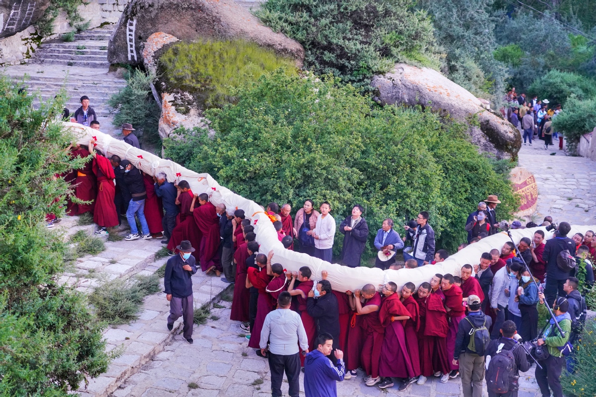 8月16日,西藏拉薩哲蚌寺,僧人將巨幅唐卡抬往展佛臺(tái)。西藏日?qǐng)?bào)社 平措次仁 攝