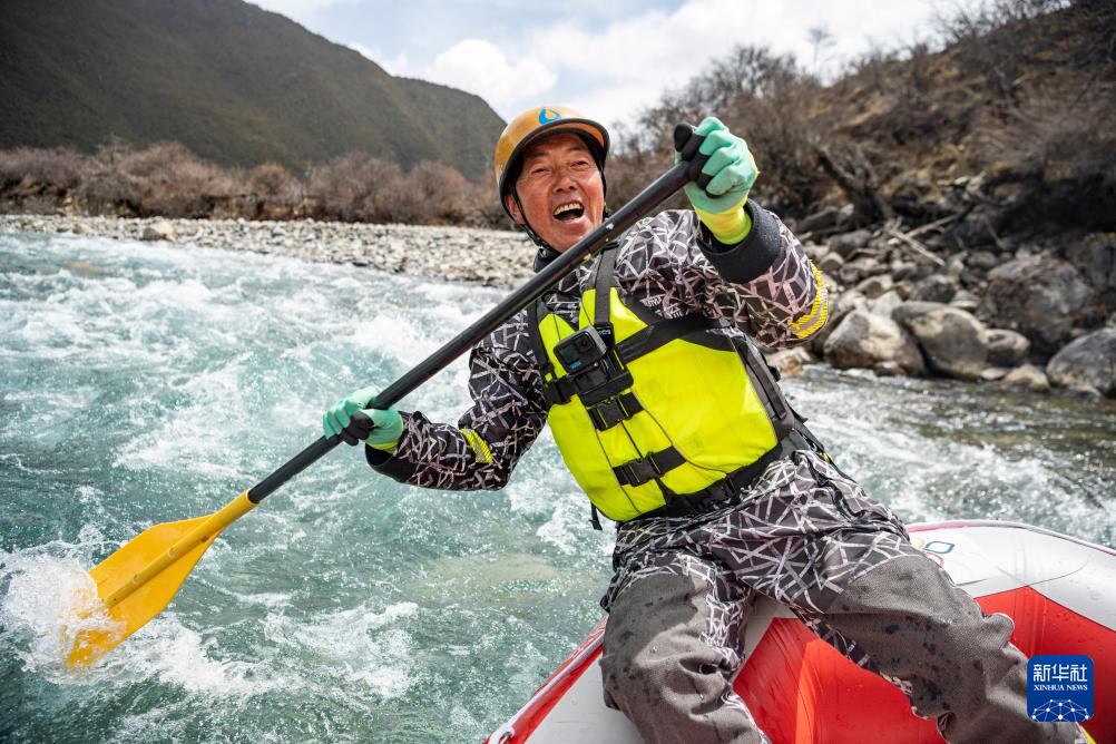 扎史品初正在巴河上漂流(4月14日攝)。新華社記者 孫非 攝