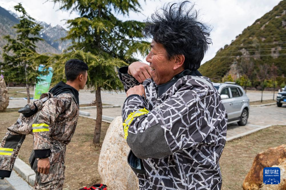 扎史品初(右)正在更換漂流用的連體服(4月14日攝)。新華社記者 孫非 攝