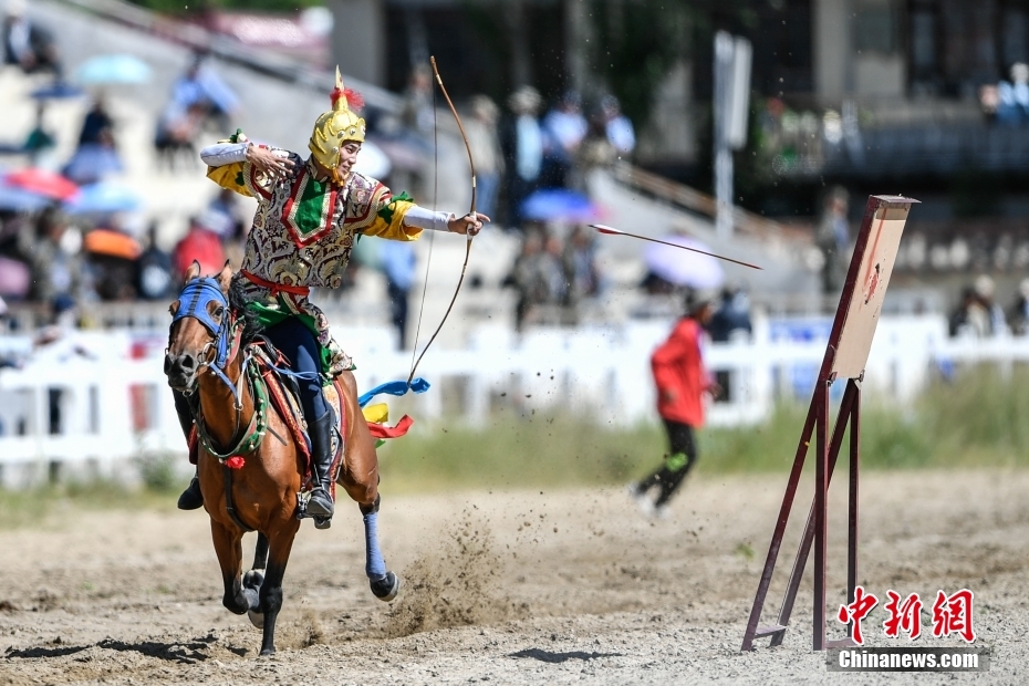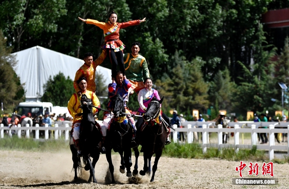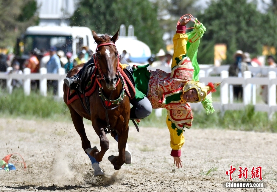 8月17日,騎手們進行馬術表演。當日,2023年拉薩雪頓節(jié)民族傳統(tǒng)馬術表演在西藏拉薩市北郊賽馬場舉行。